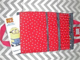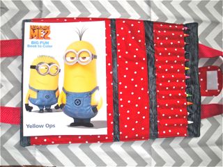 Crayons fit perfectly in their own little pockets while the coloring book has his own larger pocket to keep him safe.